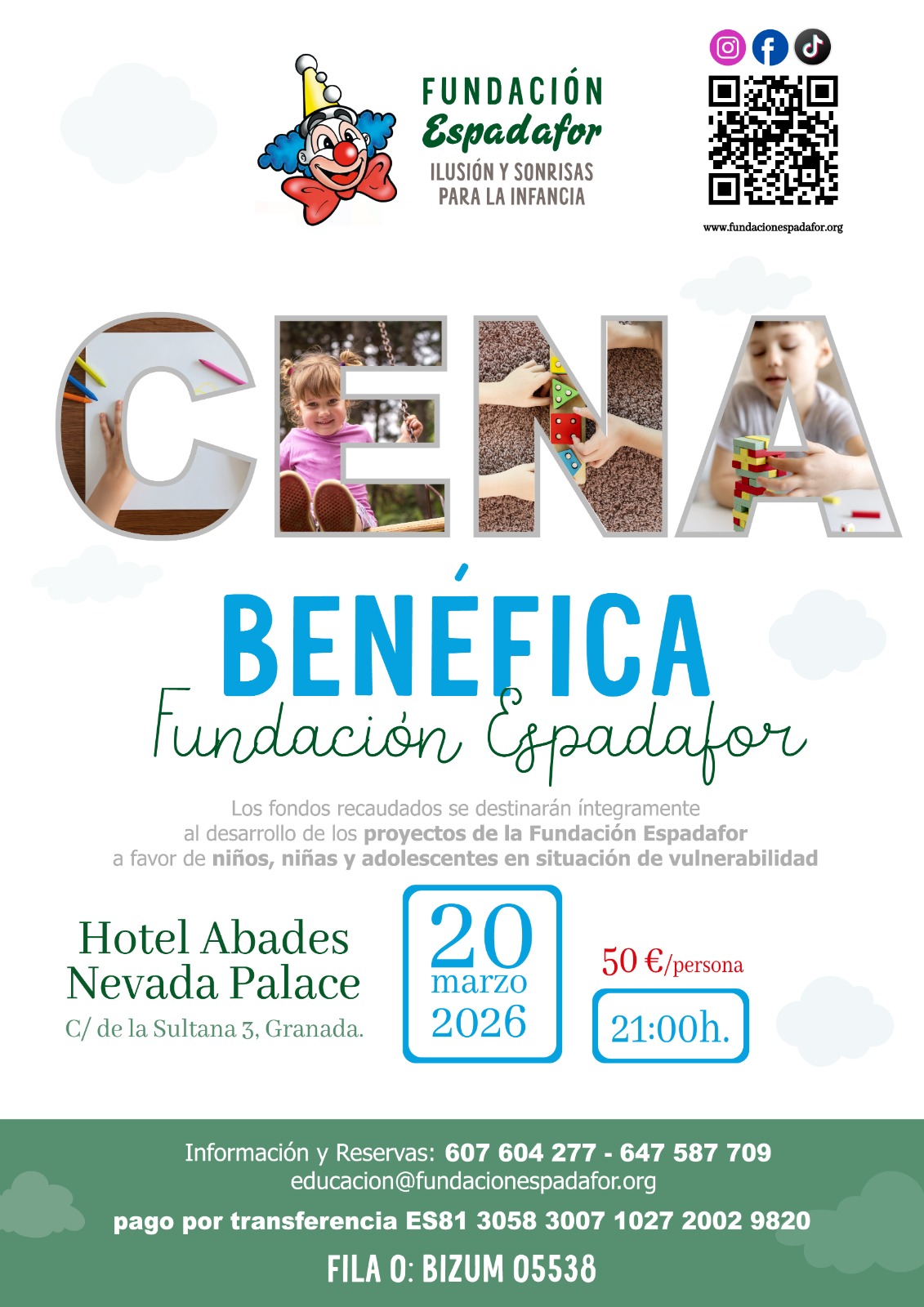Desde la Fundación Espadafor estamos emocionados de invitaros a nuestra cena benéfica el próximo 20 de marzo de 2026. Será una noche para compartir, disfrutar y, sobre todo, apoyar a los más pequeños que más lo necesitan. Nos vemos a las 21:00 h en el Hotel Abades Nevada Palace (Calle de la Sultana, 3), en Granada, en un ambiente cercano